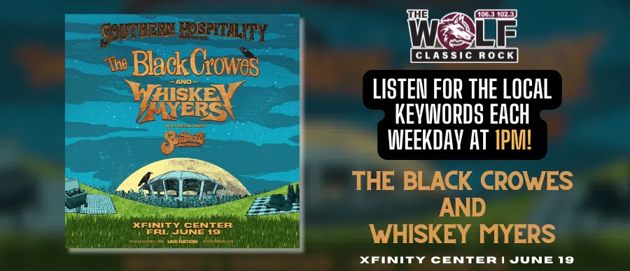 The Wolf has your chance to win tickets to The Black Crowes & Whiskey Myers "Southern Hospitality Tour" at Xfinity Center on Friday, June 19th! Listen to Heather Gersten from Mon, 2/9 thru Fri, 2/13 in the 1pm hour for the local text keyword to TEXT IN to 401-272-5483 for your chance to WIN tickets!